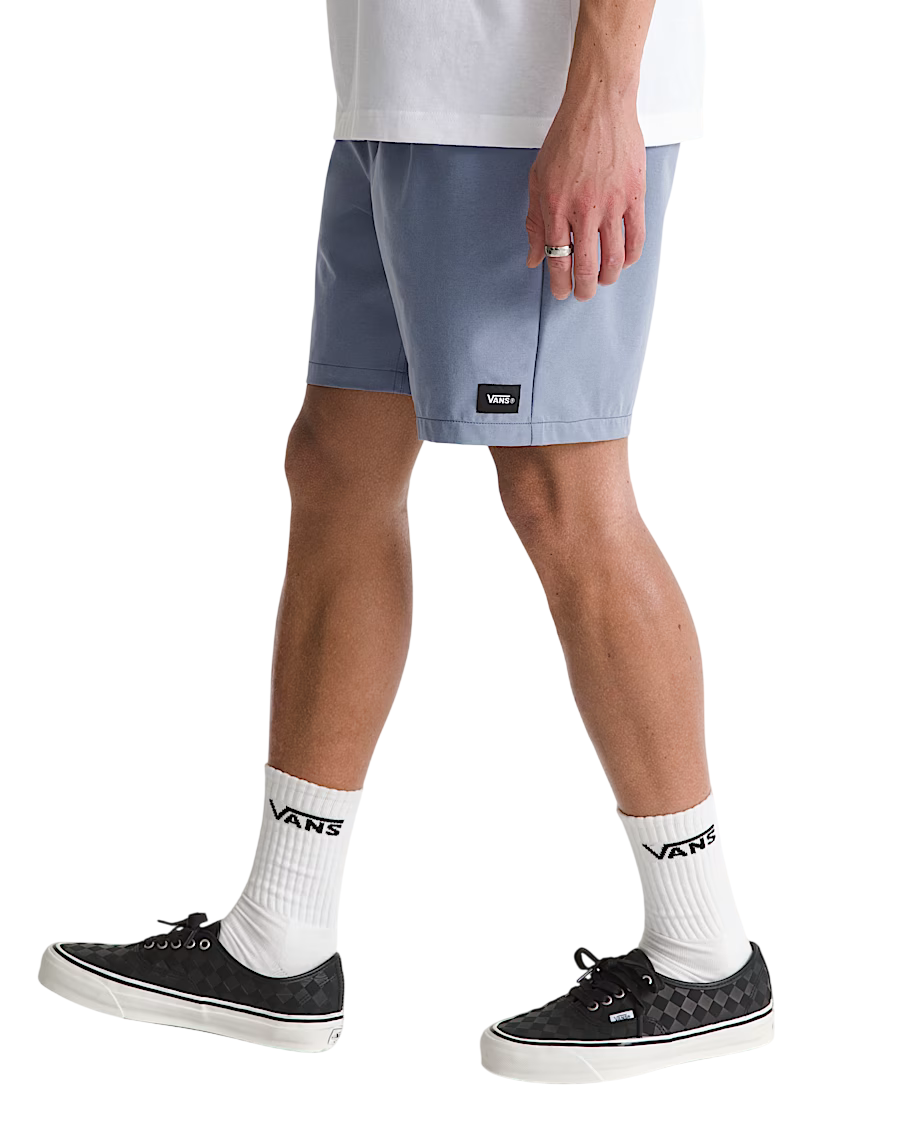 Sport shorts with elastic waistband and drawcord for a secure, easy fit Lightweight stretch polyester helps you move freely Durable water repellent (DWR) coating sheds light moisture Back welt pockets and front slash pockets keep small items close Woven Vans logo label at hem keeps it rooted in the Range family Relaxed fit for easy movement and a laid-back feel 100% polyester - Características do Produto